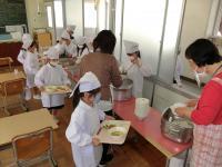 給食の時間を利用して、栄養教諭の先生が1年生に給食まめ知識を教えてくれました。調理員さんが衛生に気を付け、たくさんの料理を安全に作ってくれていることを知ることができました。